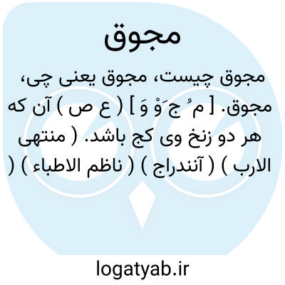 مجوق. [ م ُ ج َوْ وَ ] ( ع ص ) آن که هر دو زنخ وی کج باشد. ( منتهی الارب ) ( آنندراج ) ( ناظم الاطباء ) ( از اقرب الموارد ).