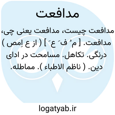 مدافعت. [ م ُ ف َ ع َ ] ( از ع اِمص ) درنگی. تکاهل. مسامحت در ادای دین. ( ناظم الاطباء ). مماطله. دفعالوقت کردن. مخالفت کردن: مصرح گفته آمده است که اگر آنچه مثال دادیم به زودی آن را امضا نباشد و به تعلل و مدافعتی مشغول شده آیدناچار ما را باز باید گشت. ( تاریخ بیهقی ص 74 ). ثقات... گفتند روی ندارد فرستادن و در این مدافعت می رفت. ( تاریخ بیهقی ). چون دانستند که از مدافعت فایده نخواهد بود. ( جهانگشای جوینی ). || مقاومت. مزاحمت. بازداشتگی. ممانعت. ( ناظم الاطباء ). جلوگیری. دفع کردن. ممانعت کردن. بازداشتن. رجوع به مدافعة شود: پنج فیل با فوجی از مردان کار به مدافعت ایشان فرستاد. ( ترجمه تاریخ یمینی ص 426 ). می خواست تا به مدافعت لشکر اسلام بایستد و نگذارد که کسی از آب بگذرد. ( ترجمه تاریخ یمینی ص 425 ). || راندگی. ردکردگی. از خود دورکردگی. ( ناظم الاطباء ).