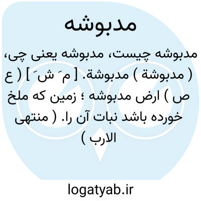 ( مدبوشة ) مدبوشة. [ م َ ش َ ] ( ع ص ) ارض مدبوشه؛ زمین که ملخ خورده باشد نبات آن را. ( منتهی الارب ) ( از متن اللغة ) ( از اقرب الموارد ). گویند: مکان مدبوش و ارض مدبوشة. ( اقرب الموارد ).