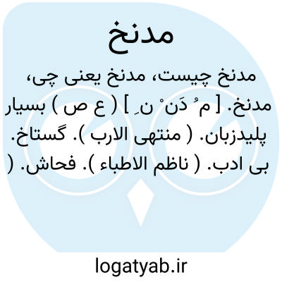 مدنخ. [ م ُ دَن ْ ن ِ ] ( ع ص ) بسیار پلیدزبان. ( منتهی الارب ). گستاخ. بی ادب. ( ناظم الاطباء ). فحاش. ( متن اللغة ) ( اقرب الموارد ). || آنکه در سر وی بلندی و پستی باشد. ( منتهی الارب ) ( از اقرب الموارد ): مدنخ الرأس؛ آن که در سرش ارتفاع و انخفاض باشد. ( از متن اللغة ). || آنکه سر خود را پست کند. ( آنندراج ). آنکه فروتنی می کند و سر خود را پست می نماید.( ناظم الاطباء ). نعت فاعلی است از تدنیخ. رجوع به تدنیخ شود. || ملازم خانه. ( آنندراج ). آنکه ملازم خانه می گردد. ( ناظم الاطباء ). رجوع به تدنیخ شود.