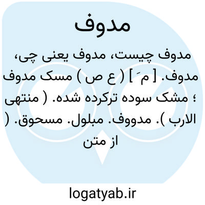 مدوف. [ م َ ] ( ع ص ) مسک مدوف؛ مشک سوده ترکرده شده. ( منتهی الارب ). مدووف. مبلول. مسحوق. ( از متن اللغة ). نعت مفعولی است از دوف و دَیف. رجوع به دوف شود.