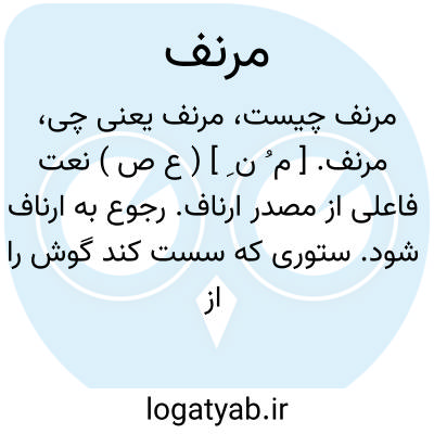 مرنف. [ م ُ ن ِ ] ( ع ص ) نعت فاعلی از مصدر ارناف. رجوع به ارناف شود. ستوری که سست کند گوش را از ماندگی.( آنندراج ). || مرد شتابنده. ( آنندراج ).