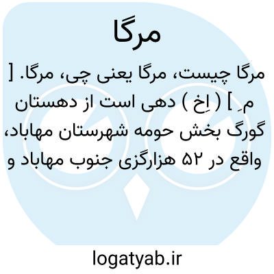 مرگا. [ م ِ ] ( اِخ ) دهی است از دهستان گورگ بخش حومه شهرستان مهاباد، واقع در 52 هزارگزی جنوب مهاباد و 10هزارگزی جنوب خاوری راه شوسه مهاباد به سردشت. آب آن از رودخانه سیناس و راه آن مالرو است. ( از فرهنگ جغرافیایی ایران ج 4 ).