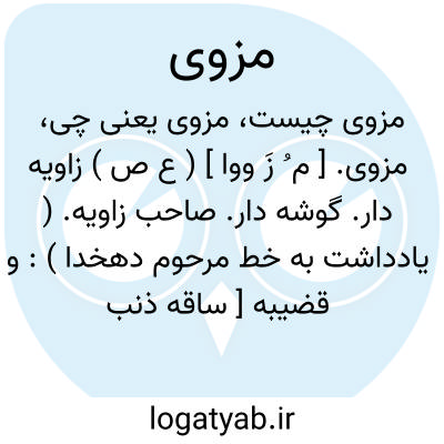 مزوی. [ م ُ زَ ووا ] ( ع ص ) زاویه دار. گوشه دار. صاحب زاویه. ( یادداشت به خط مرحوم دهخدا ): و قضیبه [ ساقه ذنب الخروف ] مستدیر مزوی و دقیق الاطراف. ( ابن البیطار برابر کلمه ذنب الخروف ). || ترنجیده. ( یادداشت به خط مرحوم دهخدا ).