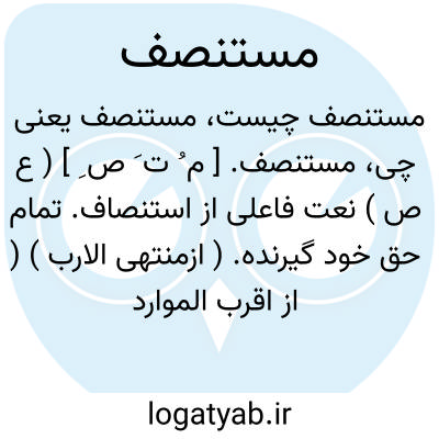 مستنصف. [ م ُ ت َ ص ِ ] ( ع ص ) نعت فاعلی از استنصاف. تمام حق خود گیرنده. ( ازمنتهی الارب ) ( از اقرب الموارد ). || انصاف خواهنده. ( از اقرب الموارد ). رجوع به استنصاف شود.