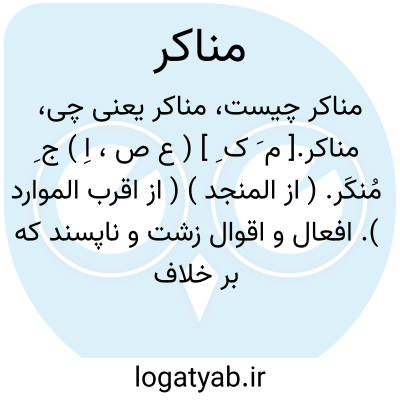 ( صفت ) جمع منکر اقوال و افعالی که بر خلاف رضای خداست: [ یکی آنکه در عنفوان جوانی و ریعان کامرانی که مجال وساوس شیطانی فسیح تر باشد و میدان هواجس جسمانی بسیط تر از مناکر و مناهی دست بداشته است... ] ( المعجم. مد. چا.۱۱:۱ )