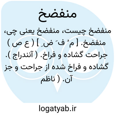 منفضخ. [ م ُ ف َ ض ِ ] ( ع ص ) جراحت گشاده و فراخ. ( آنندراج ). گشاده و فراخ شده از جراحت و جز آن. ( ناظم الاطباء ) ( از منتهی الارب ) ( از اقرب الموارد ). || دلو آب ریزان. ( آنندراج ). دلو آب ریخته شده. ( ناظم الاطباء ) ( از منتهی الارب ) ( از اقرب الموارد ). || سخت گرینده. || کوهان شتر شکسته شده. ( آنندراج ) ( ناظم الاطباء ) ( از منتهی الارب ) ( از اقرب الموارد ). رجوع به انفضاخ شود.