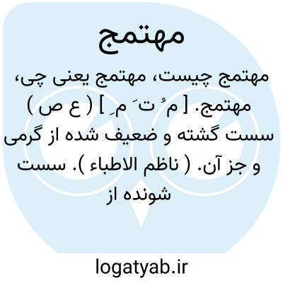 مهتمج. [ م ُ ت َ م ِ ] ( ع ص ) سست گشته و ضعیف شده از گرمی و جز آن. ( ناظم الاطباء ). سست شونده از گرمی و جز آن. ( آنندراج ) ( منتهی الارب ). || پژمرده روی گردیده. ( ناظم الاطباء ). روی خشک و پژمریده. ( آنندراج ) ( از منتهی الارب ). و رجوع به اهتماج شود.