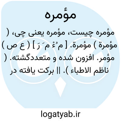 ( مؤمرة ) مؤمرة. [ م ُءْ م َ رَ ] ( ع ص ) مؤمر. افزون شده و متعددگشته. ( ناظم الاطباء ). || برکت یافته در نسل و اولاد. ( منتهی الارب ). و رجوع به مؤمر شود.