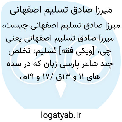 [ویکی فقه] تَسْلیم، تخلص چند شاعر پارسی زبان که در سده های ۱۱ و ۱۳ق /۱۷ و ۱۹م، در ایران و هند می زیستند. یکی از شعرایی که به تسلیم تخلص یافته میرزا صادق تسلیم اصفهانی است.