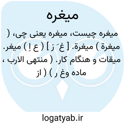 ( میغرة ) میغرة. [ غ َ رَ ] ( ع اِ ) میغر. میقات و هنگام کار. ( منتهی الارب، ماده وغ ر ) ( از آنندراج ) ( ناظم الاطباء ). وعده جای و وعده گاه. ( منتهی الارب ) ( آنندراج ) ( ناظم الاطباء ). میغر. رجوع به میغر شود. || جای کار. ( منتهی الارب ) ( آنندراج ) ( ناظم الاطباء ). میغر.