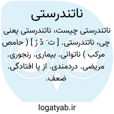 ناتندرستی. [ ت َ دُ رُ ] ( حامص مرکب ) ناتوانی. بیماری. رنجوری. مریضی. دردمندی. از پا افتادگی. ضعف. علت. علیلی:
