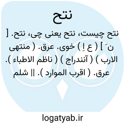 نتح. [ ن َ ] ( ع اِ ) خوی. عرق. ( منتهی الارب ) ( آنندراج ) ( ناظم الاطباء ). عرق. ( اقرب الموارد ). || شلم درخت. ( ناظم الاطباء ). رجوع به نتوح شود. || ( مص ) بیرون آمدن خوی از پوست. نتوح. ( منتهی الارب ) ( از اقرب الموارد ) ( آنندراج ). تراویدن خوی. ( از ناظم الاطباء ). خروج عرق از جسم. ( از المنجد ). تراویدن عرق از تن. ( تاج المصادر بیهقی ). || بیرون کردن گرما خوی را. ( منتهی الارب ) ( آنندراج ) ( از ناظم الاطباء ) ( از المنجد ). || ترابیدن چربش از خیک و تری از زمین. ( منتهی الارب ) ( آنندراج ). تراوش کردن. ( از ناظم الاطباء ). ترابیدن چربی ازخیک و تری از زمین. ( ناظم الاطباء ) ( از اقرب الموارد ). ترشح کردن چربی از ظرف. نتوح. ( از المنجد ). || ترابیدن آب از مَشک. ( تاج المصادر بیهقی ).