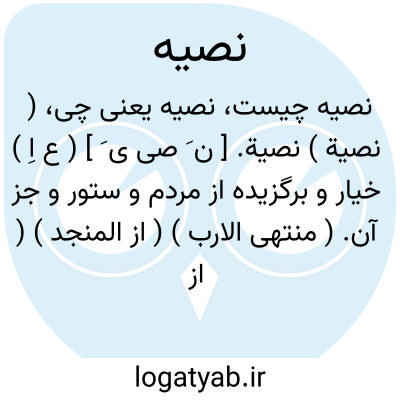 ( نصیة ) نصیة. [ ن َ صی ی َ ] ( ع اِ ) خیار و برگزیده از مردم و ستور و جز آن. ( منتهی الارب ) ( از المنجد ) ( از ناظم الاطباء ) ( از اقرب الموارد ) ( آنندراج ). برگزیدگان و اشراف قوم. ( از متن اللغة ). بهین چیز. ( مهذب الاسماء ). || اسم است از انتصاء به معنی برگزیدن. ( از متن اللغة ). || باقی مانده از مال و جز آن. ( از متن اللغة ). بقیة. ( از اقرب الموارد ) ( المنجد ).ج، نَصی. جج، انصاء، اناص. ( المنجد ) ( اقرب الموارد ). || واحد نَصی است به معنی نبات سبط. ( از المنجد ) ( از اقرب الموارد ). رجوع به نَصی شود.