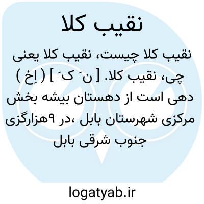 نقیب کلا. [ ن َ ک َ ] ( اِخ ) دهی است از دهستان بیشه بخش مرکزی شهرستان بابل،در 9هزارگزی جنوب شرقی بابل، در دشت معتدل هوای مرطوبی واقع است و 160 تن سکنه دارد. آبش از فاضلاب چشمه ٔجنید، محصولش برنج و کنف و پنبه و غلات و نیشکر، شغل اهالی زراعت است. ( از فرهنگ جغرافیایی ایران ج 2 ).