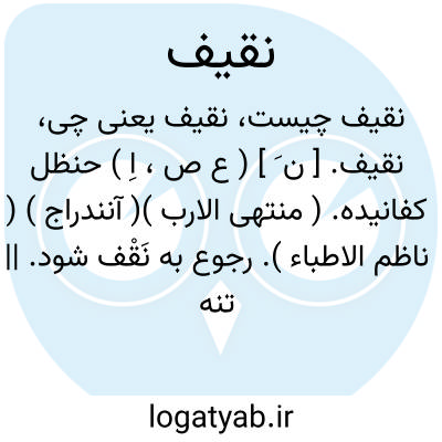 نقیف. [ ن َ ] ( ع ص، اِ ) حنظل کفانیده. ( منتهی الارب )( آنندراج ) ( ناظم الاطباء ). رجوع به نَقْف شود. || تنه درخت. ( منتهی الارب ) ( آنندراج ). رجوع به معنی بعدی شود. || جذع نقیف؛ تنه درخت دیوچه خورده. ( منتهی الارب ) ( آنندراج ) ( ناظم الاطباء ). تنه درخت که ارضة آن را خورده باشد. ( از اقرب الموارد ) ( از متن اللغة ). ج، نُقْف. و رجوع به منقوف شود.