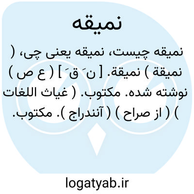 ( نمیقة ) نمیقة. [ ن َ ق َ ] ( ع ص ) نوشته شده. مکتوب. ( غیاث اللغات ) ( از صراح ) ( آنندراج ). مکتوب. رساله.نامه. ( ناظم الاطباء ). رجوع به نَمْق و تنمیق شود.