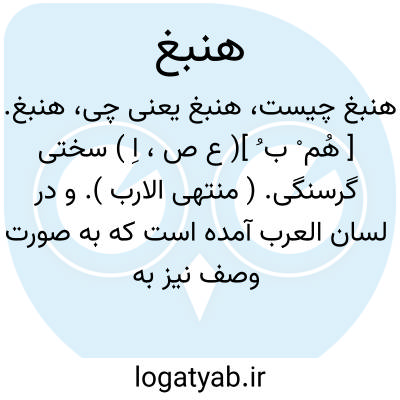هنبغ. [ هُم ْ ب ُ ]( ع ص، اِ ) سختی گرسنگی. ( منتهی الارب ). و در لسان العرب آمده است که به صورت وصف نیز به کار رود. گویند: جوع ٌ هنبغ و هنباغ و هنبوغ؛ أی شدید. || خاکی که به کمتر بادی به هوا خیزد. || شیربیشه. ( اقرب الموارد ) ( منتهی الارب ). || زن ضعیف حمله. ( از اقرب الموارد ). زن سست گیر. ( منتهی الارب ). || زن گول. ( اقرب الموارد ) ( منتهی الارب ). || زن تبهکار. ( از اقرب الموارد ).