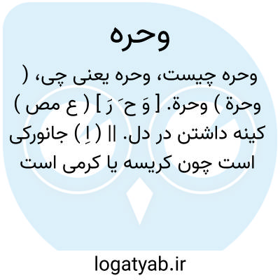 ( وحرة ) وحرة. [ وَ ح َ رَ ] ( ع مص ) کینه داشتن در دل. || ( اِ ) جانورکی است چون کریسه یا کرمی است سرخ بر زمین چفسیده بر هر چیز که بگذرد زهرناک سازد آن را. ( ناظم الاطباء ) ( منتهی الارب ) جنبنده ای است چون کرباسک. ( مهذب الاسماء ). ج،وَحَر. ( منتهی الارب ) ( از اقرب الموارد ). || ( ص ) شتر کوتاه بالا. ( منتهی الارب ) ( ناظم الاطباء ).