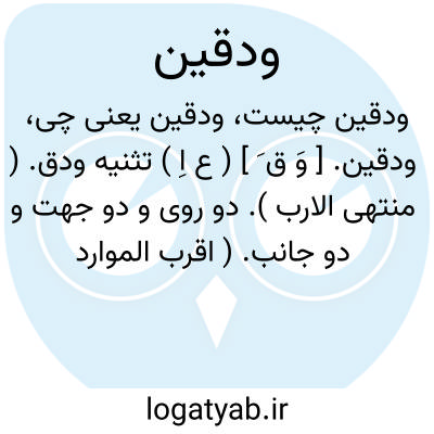 ودقین. [ وَ ق َ ] ( ع اِ ) تثنیه ودق. ( منتهی الارب ). دو روی و دو جهت و دو جانب. ( اقرب الموارد ) ( ناظم الاطباء ). رجوع به ودق شود.