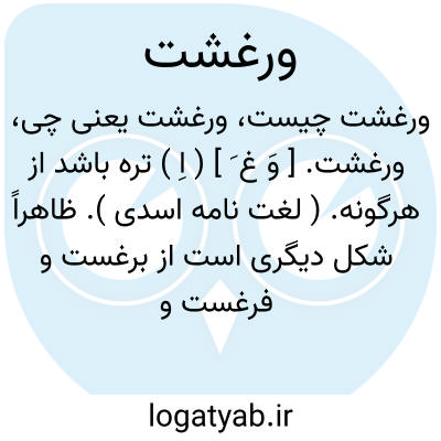 ورغشت. [ وَ غ َ ] ( اِ ) تره باشد از هرگونه. ( لغت نامه اسدی ). ظاهراً شکل دیگری است از برغست و فرغست و ورغست. رجوع به ورغست شود. || ( ص ) صاف و روشن و شفاف. ( ناظم الاطباء ).