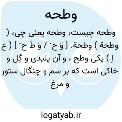 ( وطحة ) وطحة. [ وَ ح َ / وَ طَ ح َ ] ( ع اِ ) یکی وطح، و آن پلیدی و گِل و خاکی است که بر سم و چنگال ستور و مرغ چسبد. ( ناظم الاطباء ) ( از منتهی الارب ).