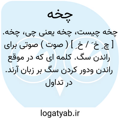 چخه. [ چ ِ خ َ / خ ِ ] ( صوت ) صوتی برای راندن سگ. کلمه ای که در موقع راندن ودور کردن سگ بر زبان آرند. در تداول روستائیان فیض آباد محولات بخش تربت حیدریه؛ لفظی راندن سگ را. || ( اِ ) سگ در زبان اطفالی که تازه سخن گفتن آموزند. سگ در زبان اطفال دوسه ساله. رجوع به چخی شود.