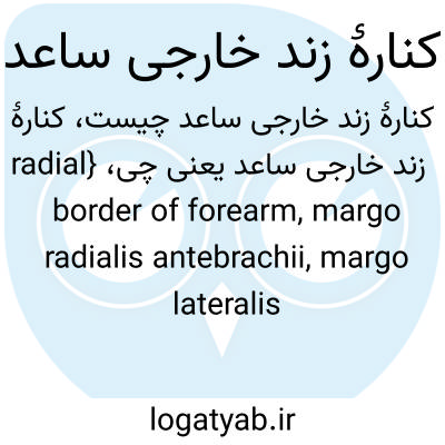{radial border of forearm, margo radialis antebrachii, margo lateralis antebrachii} [علوم تشریحی] خطی فرضی در خارجی ترین قسمت ساعد که سطح پیشین و پسین ساعد را از هم جدا می کند متـ. کنارۀ زند خارجی lateral border of forearm