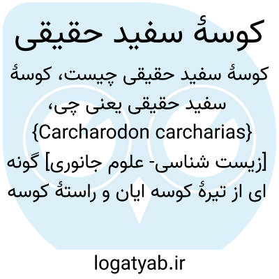 {Carcharodon carcharias} [زیست شناسی- علوم جانوری] گونه ای از تیرۀ کوسه ایان و راستۀ کوسه سانان و بالاراستۀ نرم آبشش داران که بسیار بزرگ است و سطح پشتی آن خاکستری مایل به آبی است و بین رنگ سطوح پشتی و شکمی مرز کاملاً مشخصی در پهلوها نیست