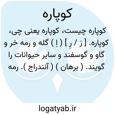 کوپاره. [ رَ / رِ ] ( اِ ) گله و رمه خر و گاو و گوسفند و سایر حیوانات را گویند. ( برهان ) ( آنندراج ). رمه و گله گاو و خر و گوسپند و دیگر چارپایان. ( ناظم الاطباء ). کوپار. ( ناظم الاطباء ). صحیح گوپاره است. ( حاشیه برهان چ معین ). در برهان مصحف گوپاره است. ( یادداشت به خط مرحوم دهخدا ). و رجوع به گوپاره شود.