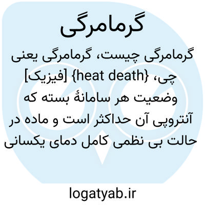 {heat death} [فیزیک] وضعیت هر سامانۀ بسته که آنتروپی آن حداکثر است و ماده در حالت بی نظمی کامل دمای یکسانی دارد و انجام کار در آن امکان پذیر نیست