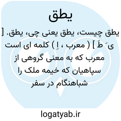 یطق. [ ی َ طَ ] ( معرب، اِ ) کلمه ای است معرب که به معنی گروهی از سپاهیان که خیمه ملک را شباهنگام در سفر حمایت کنند استعمال شده است. ابن مطروح گوید: