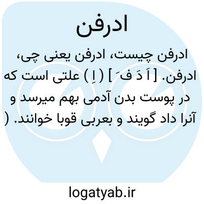 ادرفن. [ اَ دَ ف َ ] ( اِ ) علتی است که در پوست بدن آدمی بهم میرسد و آنرا داد گویند و بعربی قوبا خوانند. ( برهان قاطع ). نام علتی است که سبب آن دو چیز بود یکی خلط بد اندر تن، دوم قوه طبیعت. و خلط بد نیز دو گونه است یکی خلطی بود تیز و رقیق یا خلطی بود غلیظ و سودائی که با خون آمیخته و قوت طبیعت اخلاط بد را از اندامهای شریف بازمیدارد و بظاهر پوست دفع می کند و آنرا بریون و اگریون نیز نامند و به تازی قوبا و بهندی داد گویند. ( جهانگیری ). قوباء. ( ذخیره خوارزمشاهی ) ( منتهی الارب ). زرده. زرده زخم. حزازه. بریون. ( ذخیره خوارزمشاهی ). اگریون. داد. ( برهان ). سودا. گوارون. وِلین. اندوب. اندوج. جرب رطب. سودای رطب: قَلَه؛ چرکی اندام و چرکین و زرد شدن آن و داغ داغ شدن پوست از بسیاری ادرفن. فُوّه؛ داروئی است روشن کننده پوست از هر گونه داغ مانند پیسی ابیض و ادرفن. قَرَه َ قَرهاً؛ داغ داغ شدن پوست از بسیاری ادرفن. طُلی؛ زخمی است مانند ادرفن. ( منتهی الارب ).