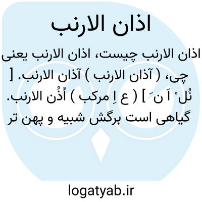 ( آذان الارنب ) آذان الارنب. [ نُل ْ اَ ن َ ] ( ع اِ مرکب ) اُذُن الارنب. گیاهی است برگش شبیه و پهن تر از برگ بارتنگ و آن نوعی از بارتنگ یعنی لسان الحمل است و آن را آذان الشّاة و آذان الغزال نیز گویند و بلغت بربری لصیقی خوانند، و بعضی گویند آذان الارنب خرگوشک فارسی است. و نیز گفته اند گیاهی است که اسبغول یعنی اسفرزه تخم آن است.