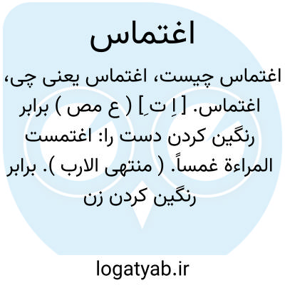 اغتماس. [ اِ ت ِ] ( ع مص ) برابر رنگین کردن دست را: اغتمست المراءة غمساً. ( منتهی الارب ). برابر رنگین کردن زن دست را. ( ناظم الاطباء ). رنگین کردن زن دست ها را بتساوی و بی نگار: اغتمست المراءة؛ غمست یدها خضاباً مستویاً من غیرتصویر. ( از اقرب الموارد ). خضاب کردن بی نگار. ( یادداشت بخط مؤلف ). || فرورفتن به آب: اغتمس فی الماء. ( منتهی الارب ) ( ناظم الاطباء ). به آب فرورفتن. ( آنندراج ). به آب فروشدن. ( المصادر زوزنی ) ( تاج المصادر بیهقی ). انغماس. ارتماس. ( یادداشت مؤلف ).