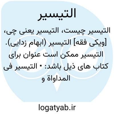 [ویکی فقه] التیسیر (ابهام زدایی). التیسیر ممکن است عنوان برای کتاب های ذیل باشد: • التیسیر فی المداواة و التدبیر، تالیف عبدالملک بن زهر (متوفی ۵۵۷ ق)• التیسیر فی القراءات السبع، نوشته ابو عمرو عثمان بن سعید الدانی به زبان عربی• التیسیر فی أصول التفسیر، نوشتاری است درباره اصول علم تفسیر، به قلم دکتر عماد علی عبد السمیع حسین• التیسیر فی قواعد علم التفسیر، تالیف محی الدین کافیجی به زبان عربی پیرامون مسائل مهم علم تفسیر• شرح کتاب التیسیر للدانی فی القراءات، تالیف عبد الواحد مالقی، شرحی بر کتاب «التیسیر» ابو عمرو دانی