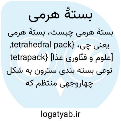 {tetrahedral pack, tetrapack} [علوم و فنّاوری غذا] نوعی بسته بندی سترون به شکل چهاروجهی منتظم که به سبب پایداری سطح و کاربرد آسان عمدتاً برای نگهداری مایعات از آن استفاده می شود