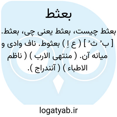 بعثط. [ ب ُ ث ُ ] ( ع اِ ) بعثوط. ناف وادی و میانه آن. ( منتهی الارب ) ( ناظم الاطباء ) ( آنندراج ). ناف و میانه بیابان. ( مؤید الفضلاء ). و رجوع به بعثوط شود. || دُبُر یا دبر با ذکر و خایه. ج، بعاثط. ( منتهی الارب ) ( آنندراج ). دبر یا دبر با آلت و بیضه. ج، بعاثط. ( ناظم الاطباء ).