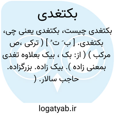 بکتغدی. [ ب َ ت ُ ] ( ترکی،ص مرکب ) ( از: بک، بیک بعلاوه تغدی بمعنی زاده ). بیک زاده. بزرگزاده. حاجب سالار. ( از فرهنگ فارسی معین ). || ( اِخ ) سالار غلامان سرایی در زمان محمود. وی یکی از رجال دولت محمودی بود که با علی قریب و یوسف سبکتکین و دیگران پس از فوت محمود امیرمحمد را برتخت نشاندند. ( از فرهنگ فارسی معین ): بکتغدی سالار غلامان سرایی و ابوالنجم ایاز و علی دایه...( تاریخ بیهقی ). و حاجب بزرگ بلکاتگین و حاجب بکتغدی حاضر بودند. ( تاریخ بیهقی ). و سالار بکتغدی را خط نبود، بونصر از جهت وی نبشت. ( تاریخ بیهقی ). و امارت وخطبه بکتغدی حاجب را دادند. ( تاریخ سیستان ص 363 ).