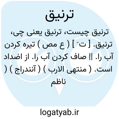 ترنیق. [ ت َ ] ( ع مص ) تیره کردن آب را. || صاف کردن آب را. از اضداد است. ( منتهی الارب ) ( آنندراج ) ( ناظم الاطباء ) ( از اقرب الموارد ) ( از المنجد ). || حرکت دادن لواء برای حمله. ( از المنجد ). || سستی تن و بینایی. ( منتهی الارب ) ( آنندراج ) ( ناظم الاطباء ) ( از اقرب الموارد ): و منه لقیت فلاناً مرنقه عیناه؛ ای منکسر الطرف من جوع و غیره. ( منتهی الارب ) ( ناظم الاطباء ). || سست کار و شوریده رأی شدن قوم. ( منتهی الارب ) ( آنندراج ) ( ناظم الاطباء ) ( از اقرب الموارد ). || پیوسته نگریستن در چیزی و انتظار کردن. ( منتهی الارب ) ( آنندراج ) ( ناظم الاطباء ) ( از اقرب الموارد ) ( از المنجد ): و منه قولهم رمدت المعزی فرنق رنق؛ ای انتظرالولادة. ( منتهی الارب ) ( ناظم الاطباء ). || شکستن بازوی مرغ به تیر یا به بیماری، چندانکه بیفتد. ( منتهی الارب ) ( آنندراج ) ( ناظم الاطباء ) ( از اقرب الموارد ). || واداشتن و بال جنبان و ثابت ماندن مرغ در هوا. ( منتهی الارب ) ( آنندراج ) ( ناظم الاطباء ) ( از اقرب الموارد ) ( از المنجد ): یقال: رنق الطائر اذا حفق بجناحیه فی الهوا و ثبت و لم یطر. ( منتهی الارب ) ( ناظم الاطباء ). || آرامیدن به جایی. ( منتهی الارب ) ( آنندراج ) ( ناظم الاطباء ). اقامت کردن قوم به جایی و احتباس بدان. ( از اقرب الموارد ) ( از المنجد ): یقال رنق و لاتعجل؛ ای توقف و انتظر. ( المنجد ). || خواب در چشم رفتن کسی را. ( از اقرب الموارد ). || حرکت کردن لواء. ( از المنجد ). || به دور خود گشتن سفینه و براه نیفتادن آن. ( از المنجد ).