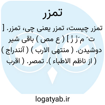 تمزر. [ ت َ م َزْ زُ ] ( ع مص ) باقی شیر دوشیدن. ( منتهی الارب ) ( آنندراج ) ( از ناظم الاطباء ). تمصر. ( اقرب الموارد ). || یک یک مکیدن. ( منتهی الارب ) ( آنندراج ). مکیدن. ( تاج المصادر بیهقی )( ناظم الاطباء ). تمصص و اندک نوشیدن شیر. ( از اقرب الموارد ). || مکیدن شراب اندک اندک. ( زوزنی ) ( از اقرب الموارد ). اندک نوشیدن شراب. ( منتهی الارب ) ( آنندراج ). جرعه جرعه نوشیدن. و اندک نوشیدن. ( ناظم الاطباء ). || بیکبارگی نوشیدن. ( منتهی الارب ) ( آنندراج ) ( ناظم الاطباء ). و رجوع به تمزز شود.
