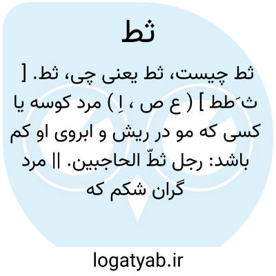 ثط. [ ث َطط ] ( ع ص، اِ ) مرد کوسه یا کسی که مو در ریش و ابروی او کم باشد: رجل ثطّ الحاجبین. || مرد گران شکم که راه رفتن نتواند. ج، اثطاط، ثُطّ، ثطان، ثطاط، ثططة.