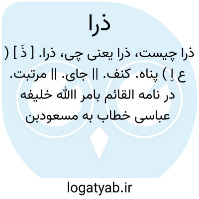 ذرا. [ ذَ ] ( ع اِ ) پناه. کنف. || جای. || مرتبت. در نامه القائم بامر اﷲ خلیفه عباسی خطاب به مسعودبن محمودبن سبکتکین به نقل تاریخ بیهقی آمده است: و قصد [ امیرالمؤمنین القائم بامر اﷲ ] علی منهاج سلفه الصالح وسلک طریقهم المنیر الواضح و هو فی المنحة علی ما یرطب لسانه من الشکر و یقابل مولم الرزیة بما اسبغ اﷲتعالی علیه من الصبر و یتلقی النازلة برضائه بقضائها علی ما سخر له الذی جل ذراه و یقضی حق الشکر فی الحالین لخالقه و مولاه... و در ترجمه ای که خود ابوالفضل از این جزء نامه کرده است گوید: و پیروی کرد و بجا آورد به روش سلف صالح خود و پیروی کرد راه روشن ایشان را و امیرالمؤمنین در نعمت و راحت ترزبان است بشکر الهی و برابری میکند با بلیه الم رسان با صبر بسیاری که خدا به او داده است و روبرو میشود با واقعه به آن طریق که رضا بقضا میدهد بر آنچه که این خلق را خدای بلندرتبه به او ارزانی داشته و در هر دو حال قضاء حق شکر خالقش مینماید و صاحبش - انتهی. || پوشش. ستر. || آنچه بر باد شود. || سرشک ریخته از چشم.