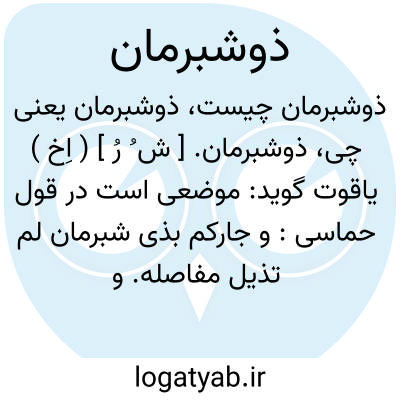 لغت نامه دهخدا ذوشبرمان. [ ش ُ رُ ] ( اِخ ) یاقوت گوید: موضعی است در قول حماسی:و جارکم بذی شبرمان لم تذیل مفاصله.و در المرصع ابن الاثیر تمام شعر آمده است و گوید از مخبل شاعر است. و قصه ای هم نقل میکند لکن هم قصه و هم شعر در نسخه ما لایقرء است.