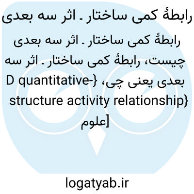 {-D quantitative structure activity relationship} [علوم دارویی] رابطۀ کمی سه بعدی بین ساختار شیمیایی دارو و فعالیت زیستی آن متـ. رساک سه بعدی 3-DSAR