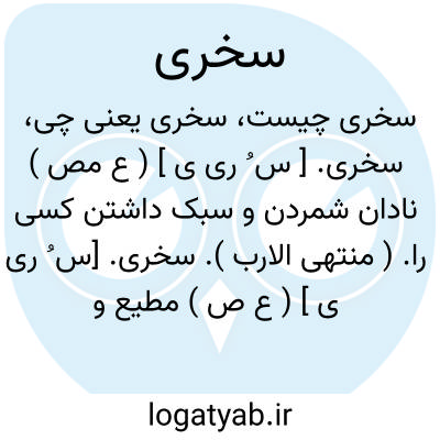 سخری. [س ُ ری ی ] ( ع ص ) مطیع و فرمانبردار. ( منتهی الارب ) ( آنندراج ). و از این معنی است قوله تعالی: لیتخذ بعضهم بعضاً سخریاً. ( قرآن 32/43 ). || آنکه مردم بر وی بسیار فسوس کنند. ( منتهی الارب ).