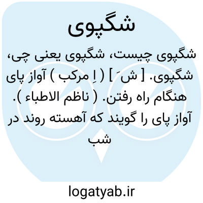 لغت نامه دهخدا شگپوی. [ ش َ ] ( اِ مرکب ) آواز پای هنگام راه رفتن. ( ناظم الاطباء ). آواز پای را گویند که آهسته روند در شب و به این معنی شلپوی و شیپوی ( شب پوی ) نیز آمده است. ( ازبرهان ) ( از آنندراج ). رجوع به مترادفات کلمه شود.