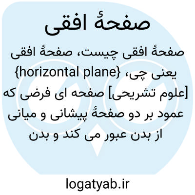 {horizontal plane} [علوم تشریحی] صفحه ای فرضی که عمود بر دو صفحۀ پیشانی و میانی از بدن عبور می کند و بدن را به دو قسمت بالا و پایین تقسیم می کند متـ. صفحۀ عرضی transverse plane, transversal plane