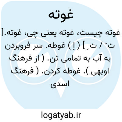 غوته.[ ت َ / ت ِ ] ( اِ ) غوطه. سر فروبردن به آب به تمامی تن. ( از فرهنگ اوبهی ). غوطه کردن. ( فرهنگ اسدی ). سر به آب فروبردن و فرورفتن در آب، و غوطه معرب آن است. ( برهان قاطع ) ( انجمن آرا )( آنندراج ). رجوع به غوته خوردن و غوته خورده شود.