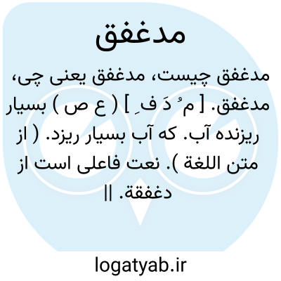 مدغفق. [ م ُ دَ ف ِ ] ( ع ص ) بسیار ریزنده آب. که آب بسیار ریزد. ( از متن اللغة ). نعت فاعلی است از دغفقة. || باران سخت بارنده در ابتدا. ( آنندراج ) ( از متن اللغة ). بارانی که در آغاز سخت بارد. ( ناظم الاطباء ). || که بپاشد و انفاق کند مال خویش را. ( از متن اللغة ). رجوع به دغفقه و دغفان شود. || ماء مدغفِق؛ مصبوب. ( متن اللغة ). || عام مدغفق؛ سال ارزانی و فراخی. ( منتهی الارب ). مخصب. ( اقرب الموارد ). || عیش مدغفق؛ زندگانی فراخ. ( ناظم الاطباء ) ( آنندراج ). رجوع به دغفق شود.